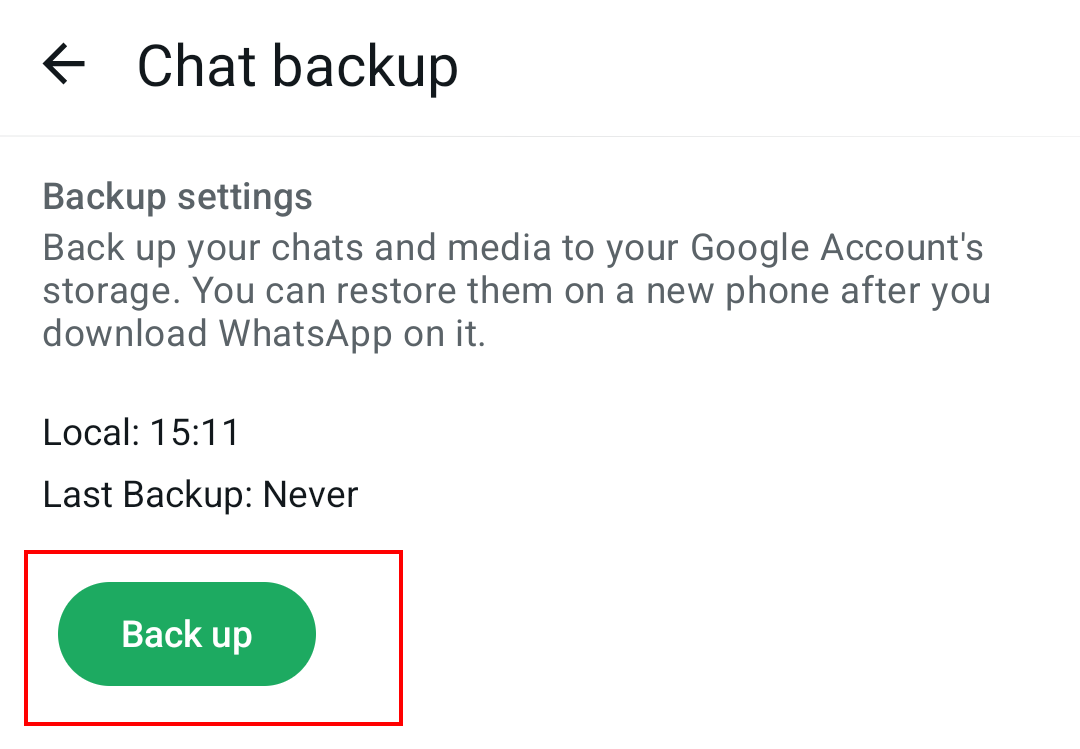Step 9: Tap ‘Back up’ to create your backup. Depending on the interval you selected, WhatsApp will save backups daily, weekly, or monthly — or only when you manually tap ‘Back up’.