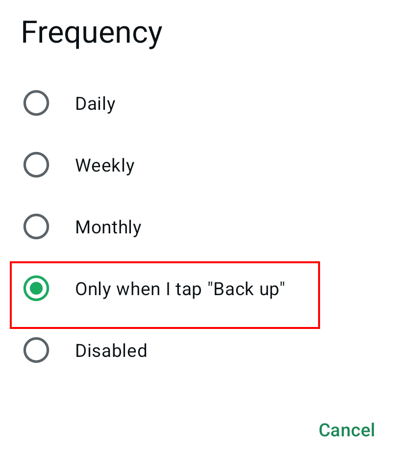 Step 7: In the menu window, select the intervals at which you want to create a backup on Google Drive, or specify if you want to set up the backup manually each time (under ‘Only when I tap “Back up”’).