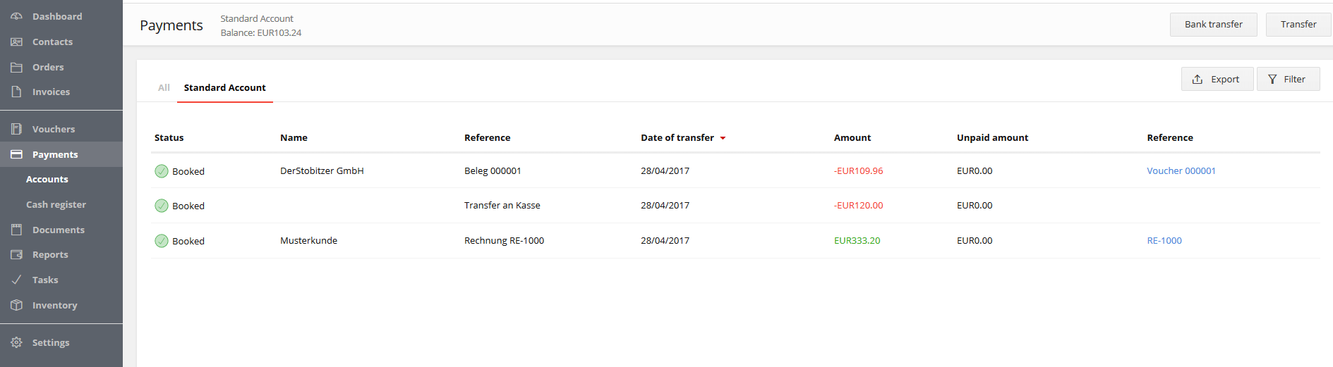 An account book enables you to keep track of all your incomings and outgoings. The software will automatically list the costs and income based on your receipts, postage expenses, and money transfers (if you connect your online banking account to the application, you can move funds directly using the tool). You can generate daily and monthly statements using an account book.
