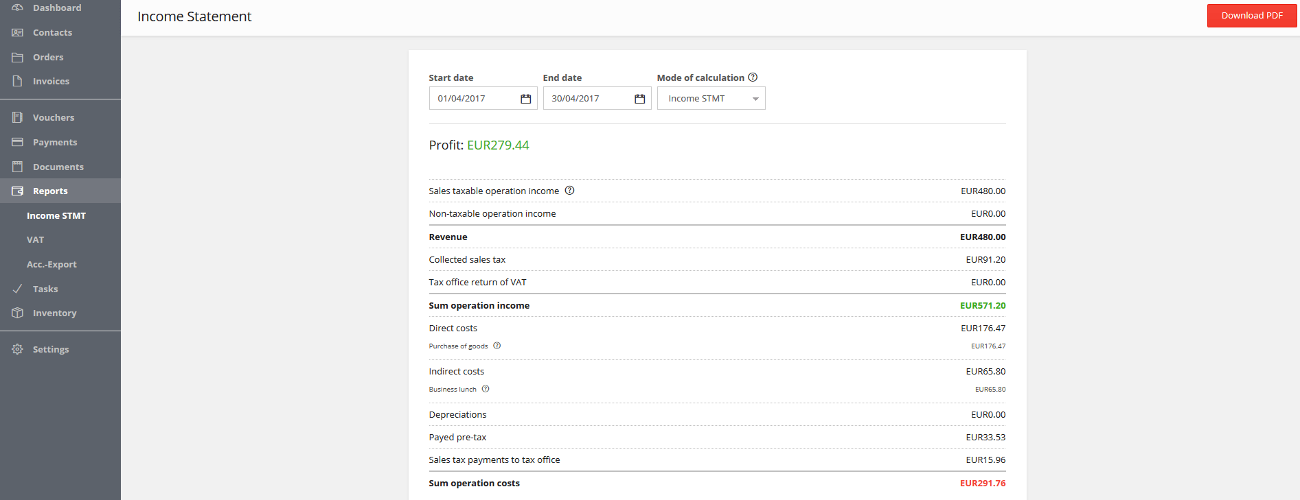 With this part of the programme, you can see how profitable your business was at a certain point in time: simply select a period and the application will show you your statement. All relevant incomings and outgoings, which are recorded in the system, are taken into account by the programme. The income statement can also be exported as a PDF.