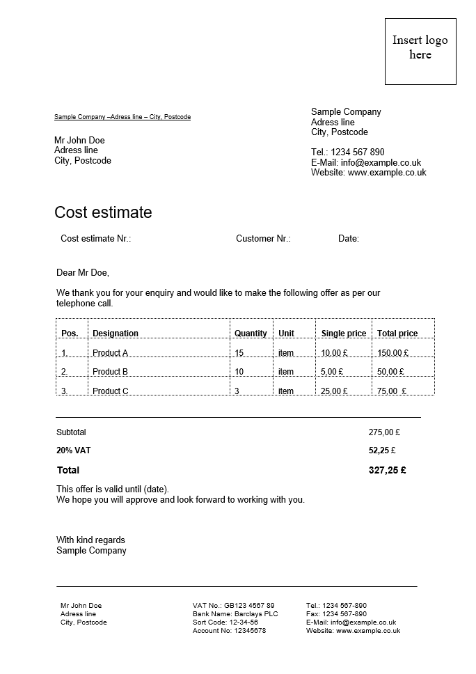 You can download this and a version for Microsoft Excel free of charge (see download section). While many users find Word easier to use, Excel provides some practical spreadsheet features, such as formulas for automatically calculating the total price of your quote.