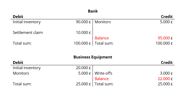 The opening balances of the accounts are taken from the opening balance sheet for the financial year. In this example, a customer first bought a product and paid the resulting receivable of £10,000 by bank transfer. As a result, £10,000 was posted to the “Bank” account on the debit side. With the “office equipment” there is a loss in value of £3,000 due to wear and tear, which is posted from an expense account (also an asset account).