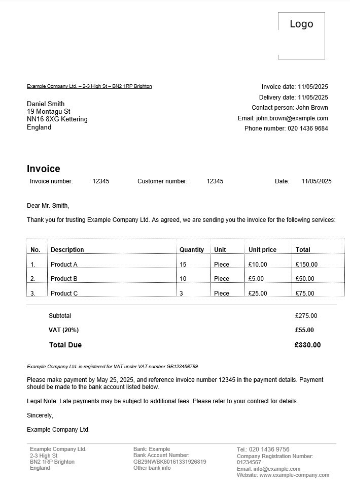 Invoice templates can generally be categorised into text-based and tabular formats. For invoices with only a few services, a text-based template is usually the better option. However, as the complexity of billable services increases, a tabular invoice template becomes more useful. This format provides a clearer structure for listing individual prices and the total amount. Additionally, some templates can include built-in functions to automatically calculate values, such as VAT, making invoicing more efficient.
