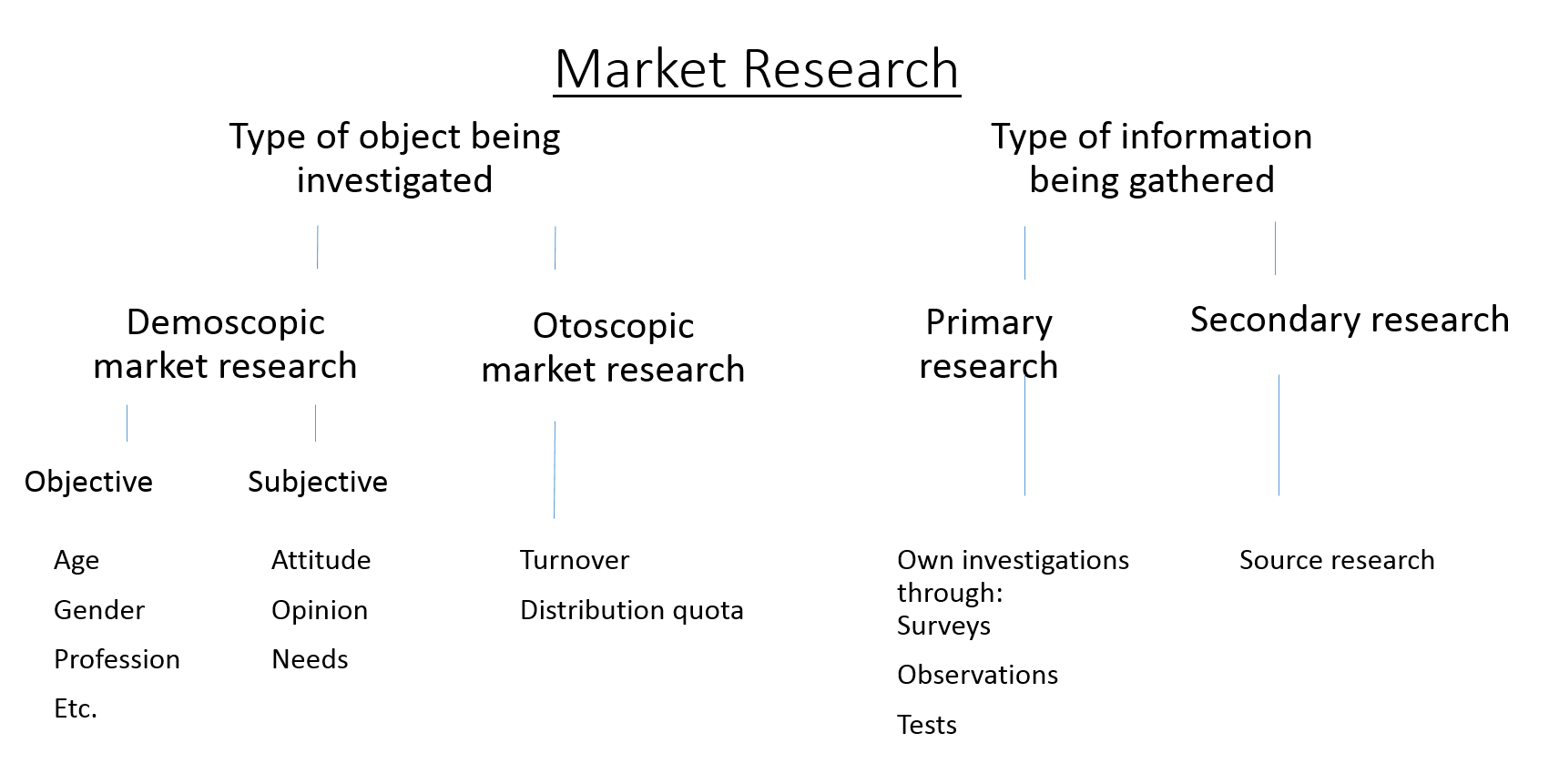 In market research, a distinction is made between the type of object studied and the type of information gathered. Both species can be divided into two further categories.