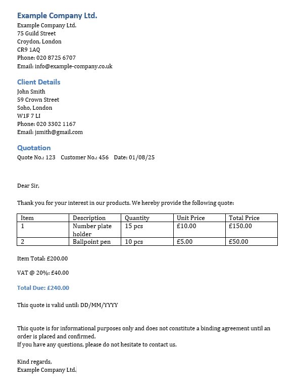 While quotes are typically not legally binding in the UK, inaccurate or incomplete information can still lead to disputes. To minimise risk, make sure your quote clearly states pricing, terms, and whether it is binding or non-binding.