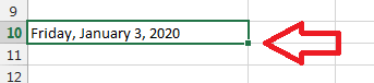 - Under the “Home” tab in the “Number” area, click the small arrow next to “Date” and select the “Long Date” format. The date is now displayed in long form and includes the day of the week.