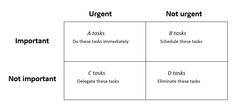 - C – urgent, but not important: These tasks should be completed quite quickly. However, the tasks are of minor importance, which is why Eisenhower recommends delegating these as much as possible.