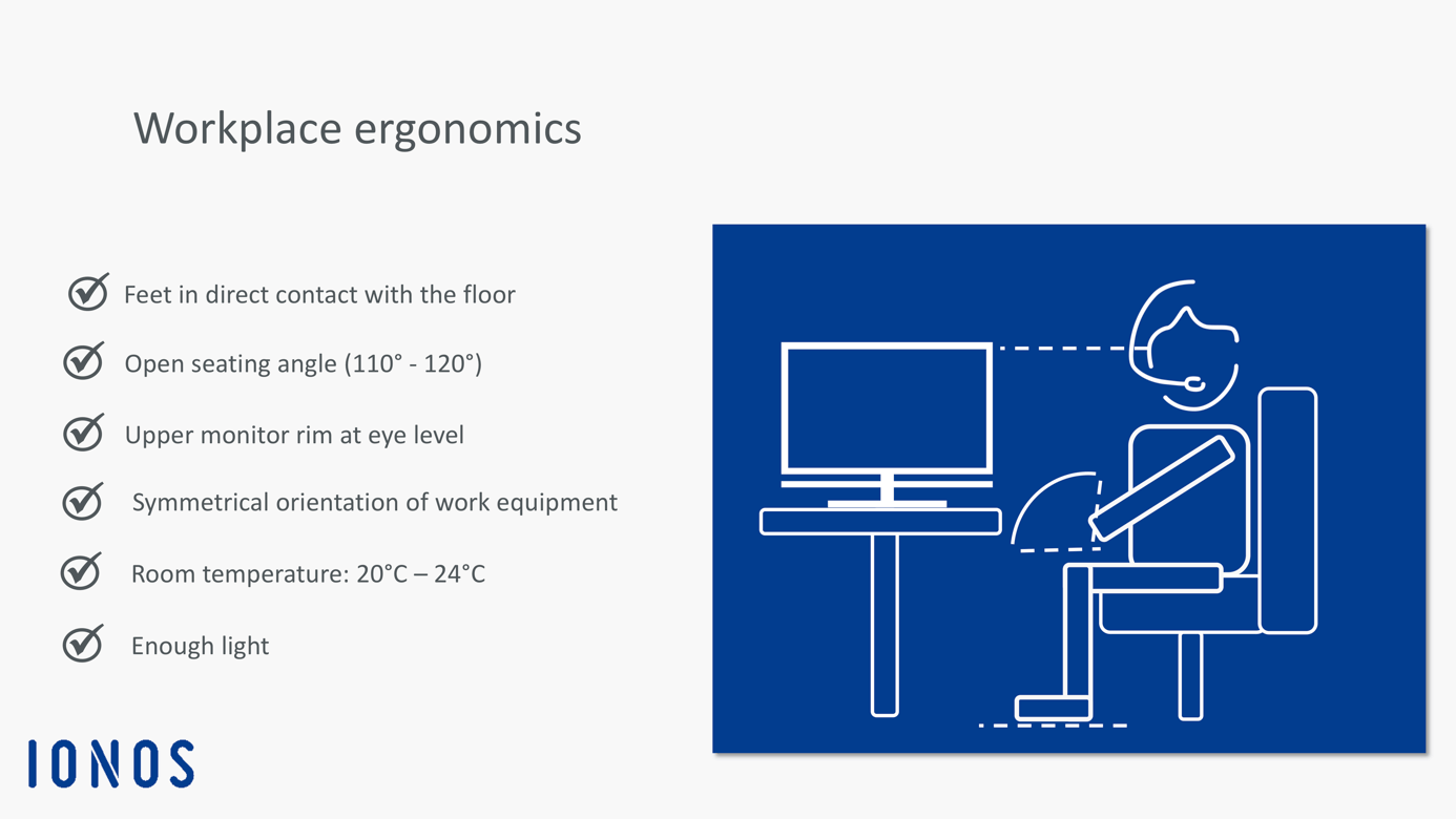 To minimise postural damage and long-term illness, it’s important to arrange your office chair, desk, and monitor in a way that allows you to sit upright and have a straight view of your computer monitor. A recommended sequence to arrange a workstation is: first chair – then desk – then work equipment.