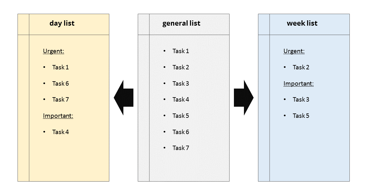In order to process your to-do list efficiently, the day and the week can be used as short-term planning periods. At the beginning of each planning period, transfer the pending tasks from your general list to a daily or weekly list. The so-called Eisenhower principle helps you to decide how to prioritise. Named after the former US President, and often quoted in counsellor reading, it suggests to first prioritise the most urgent/important tasks, and to sort out everything else after that according to importance.
