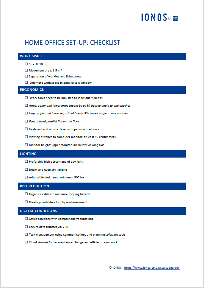 Naturally, it’s not always possible to set up a separate office for your daily work and it may also not be necessary. However, it’s recommended to make enough space available to perform your duties. The UK Health and Safety Executive offers various recommendations on setting up the right workstation including the use of ergonomic chairs and other ergonomic office equipment.