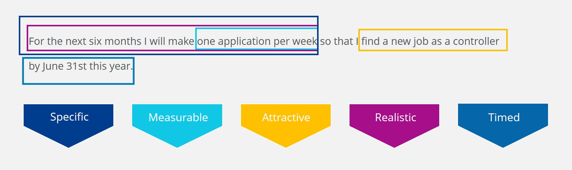 However, goals won’t be effective if you simply set a vague direction and say “Give it your best shot!”. In 1990, after years of research studying goal-setting theory, Latham and Locke showed that goals work best when they meet five specific criteria. They used the acronym “SMART” to summarise these criteria. SMART is made up of the initial letters of the five criteria.
