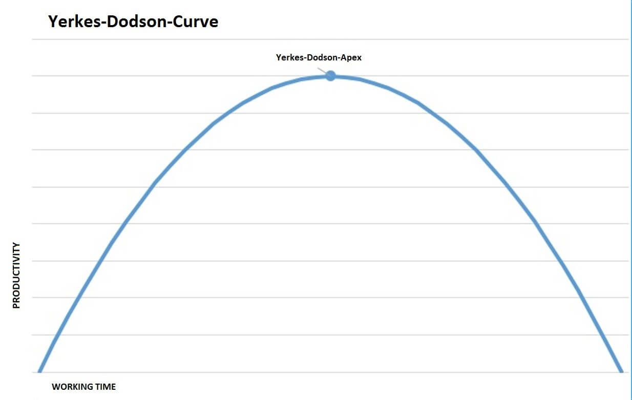 Similar to the Pareto principle, the Yerkes-Dodson curve also deals with the relationship between input and productivity. This curve was named after the psychologists Robert Yerkes and John Dodson. Their research has shown that productivity improves with increasing commitment. But this is only true up to a certain point, the point at which an increase in performance results in a reduction in productivity. This point is also called the Yerkes-Dodson apex.