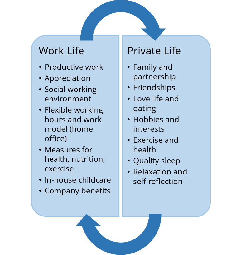 Many of the factors listed below can also work together across other categories (e.g. the ‘social working environment’ factor in work life and the ‘friendships’ factor in private life can often be combined). Additionally, it should be clear that the needs in the respective aspects of one’s life develop individually. While one employee may place great importance on hobbies and interests but is not currently interested in family planning, another employee may place more emphasis on family.