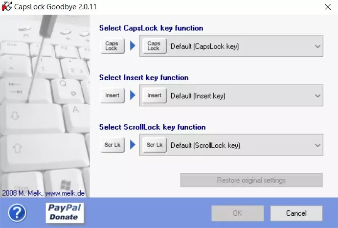 After downloading CapsLock Goodbye, unzip the .zip folder and open the program. From the user interface, you can then choose whether you want to change the functions for the Caps Lock key, the Insert key or the Scroll key: