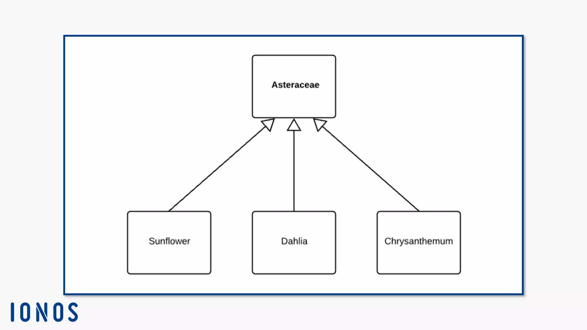 The subclass specifies the general class. This also means that the subclass shares some properties – in content and structure – with the superclass, usually the basic elements. This circumstance is called inheritance. In this example, the dahlia class shares the capitulum-shaped inflorescence with the superclass daisy. A specific feature of the genus dahlia are its eight pairs of chromosomes – other plants usually have just two pairs of chromosomes. The different dahlia species therefore form more diverse characteristics.