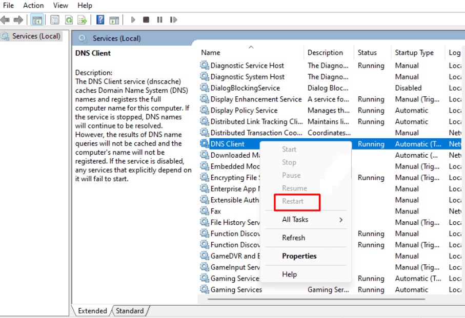 - If the service is not running, right-click the DNS Client entry and select ‘Restart’.