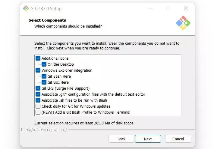 - You can then select the components that you want to install or exclude from the installation. The default setting is normally fine. A desktop shortcut is useful if you use Git Bash more often. Click 'Next' once you have chosen your preferences.