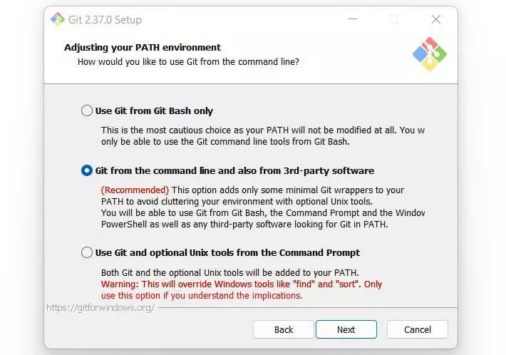 - The next step involves choosing the settings for the PATH environment. You must choose whether Git should only be used by Git Bash or whether third-party software should also be considered. The second option is recommended. This includes the command prompt and third-party. Click “Next” after that.