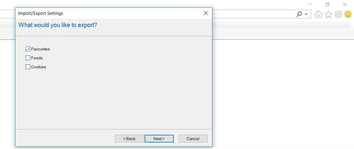 In the window that appears, choose the Export from a file option and confirm your selection by clicking “Next”. Now you must select the data you want to export. Along with your favourites, you can also back up feeds you subscribe to and current cookies. To do this, simply select the appropriate checkboxes and then choose Next:
