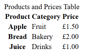 Let’s add a <caption> heading ‘Products and Prices Table’ to our previous example. Here’s the code: