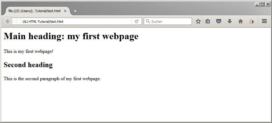 In order to structure your website’s text sections properly, it’s important to use headings. With HTML, you not only have the general ability to label these, but you can also set a clear hierarchy for all headlines you want to use. The tags <h1> to <h6> can be used, with <h1> being the main heading of the website. You should use this tag only once per page, unlike <h2> and the other heading tags. It is important to keep to a correct hierarchical order and not to jump between the different levels so that both readers and search engines can understand the text structure from the headings. We will add a main heading and a first sub-heading as an example on our test page: