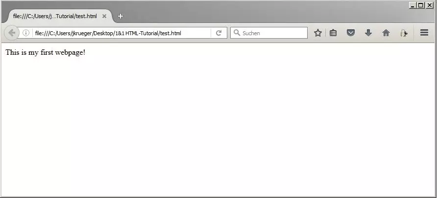 The generated file should now be displayed with your web browser’s icon. By double-clicking, you can open the page, but since all content is missing, you will see only a white page. So, in the next step, add the small sample text 'This is my first webpage!', save the document, and reopen the test.html file. The result should look something like this: