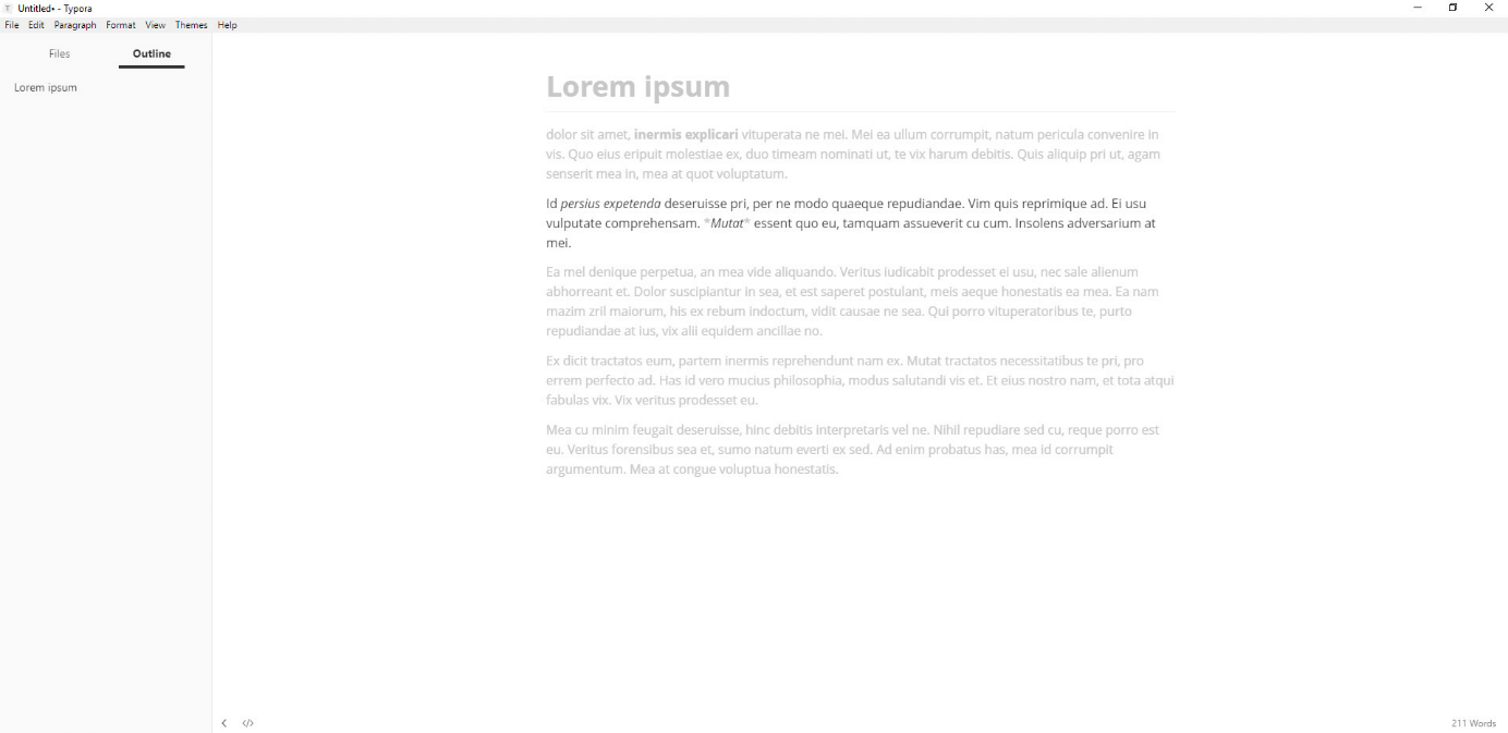 To ensure that each individual user’s experience with the program is as pleasant as possible, Typora offers a variety of themes to customise the editor’s appearance. Typora provides two modes which are designed to improve the user’s concentration: focus mode and typewriter mode. In focus mode, only the current line you are on is clearly visible while all the others are blurred. In typewriter mode, your current active line will always remain in the middle of the window. This prevents you from losing sight of what you are working on.