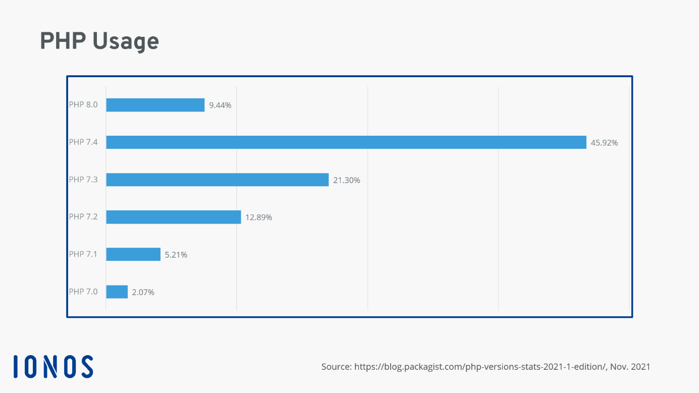 Subsequent versions PHP 7.1 and PHP 7.2 delivered improved details. PHP 7.4 is the current and final version of the 7 series. With PHP 8, the next major upgrade was delivered at the end of 2020. Here’s an illustration of the global distribution of the various PHP versions:
