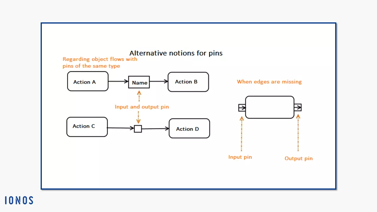 - The pin: Pins have already been cut in this version. In the first graphic, the basic notation of pins is shown. Due to their function as a link between action flows and object flows, modelers usually draw them as small rectangles directly on the action symbol. Input pins are marked with an arrow (i.e. an edge or an object flow) in the direction of the action. For output pins, the arrow leads away from the action. The following graphic shows how you can shorten pins of the same type (left) or how you can draw input and output pins if you omit the edges (right).