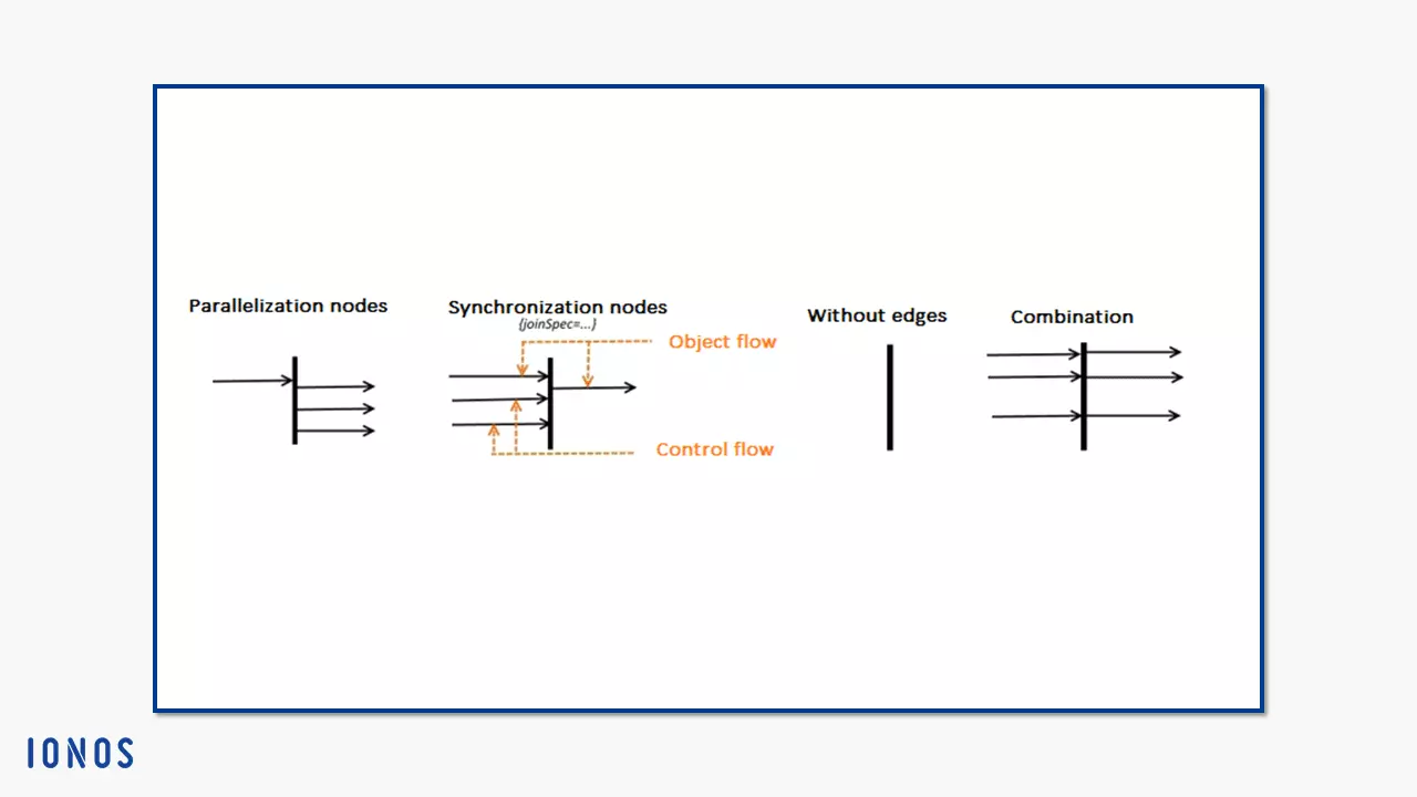 - Parallelisation nodes and synchronization nodes (fork nodes and join nodes), also called forms, are control nodes with almost identical notations that mirror their tasks. A parallelisation node divides an incoming activity edge into several, simultaneously outgoing flows. Only one activity edge can enter the parallelisation nodes. If it is a control flow, all outgoing edges are also control flows; the same principle applies to object flows. The node creates copies of the incoming token for all outgoing flows. If a token is accepted at the destination of the outgoing flow, the token is deleted from the source node. If another target does not accept its token, the parallelisation node can stop the token until it is accepted