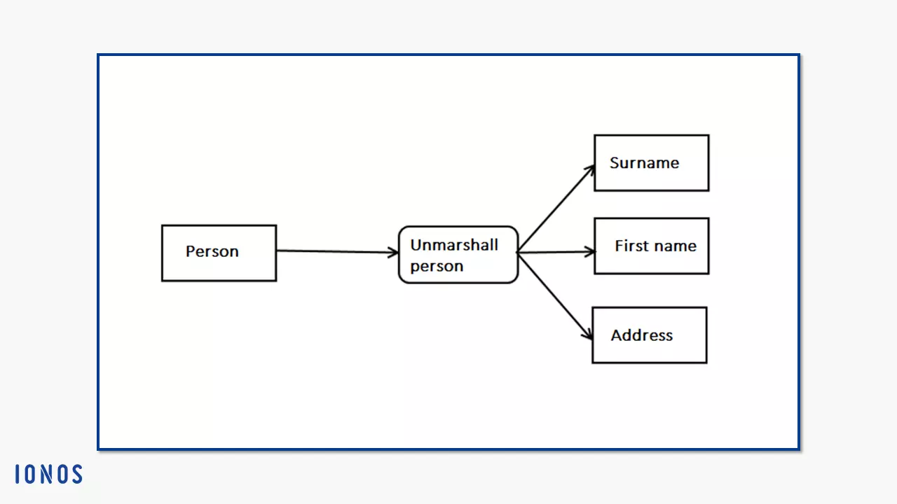 If structured data of an object or elementary data of a program has to be transferred to other programs or program sections, or if you want to save it, you have to convert it into a suitable format. This process is called marshalling. The opposite process, unmarshalling, converts this “frozen” data back into executable objects. An example of this is the transfer of UML diagrams from one tool to another program using XML conversion.