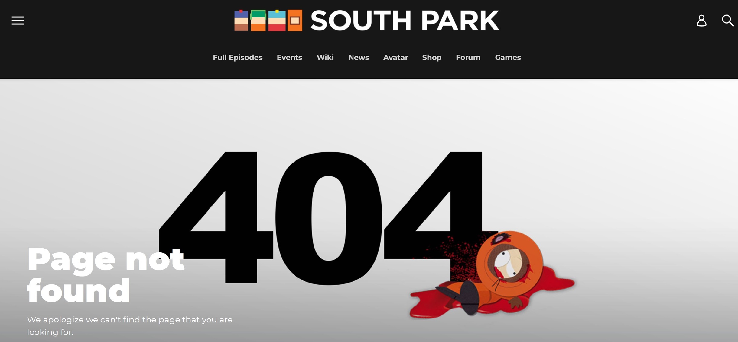 The South Park website leans into its own dark humour for the 404 page. The oversized error number is accompanied by the lifeless body of Kenny, a character famous for his constant on-screen deaths. The visual gag fits the theme perfectly, turning a technical mishap into an instantly recognisable in-joke. The clear ‘Page not found’ label and short explanation underneath keep the function of the page intact, while the design winks at fans with its tongue-in-cheek execution.
