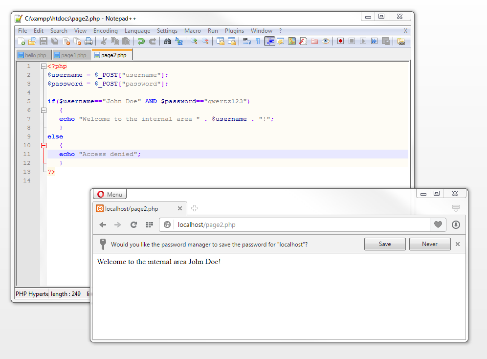 ?>phpIn our script page2.php the values for usernameandpassword are obtained and saved in the variables $username and $password. The expression within the if construct now contains two conditions linked by the logical operator AND. Both conditions have to be met (username==“John Doe”and$password==“qwertz123”) forifto return the resultTRUE.