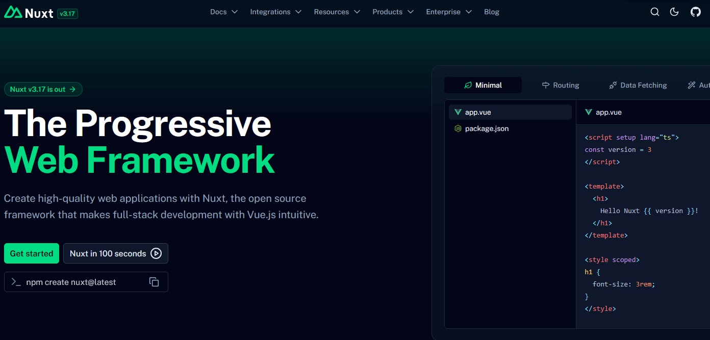 As the name suggests, Nuxt is a static site generator inspired by Next. However, instead of React, Vue is used as the component framework. Like Next, Nuxt also offers multiple deployment modes: both static site generation and server-side rendering are supported.
