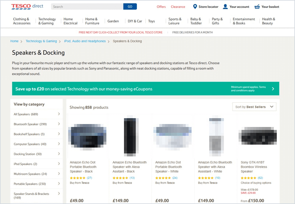 Tesco’s logo is easy tto see in the top left-hand corner. It’s simple and therefore easily recognisable and when clicked on, sends the user to the shop’s main page. The layout of the page is relatively plain and therefore doesn’t overwhelm the user, and the main two colours used: white and grey, complement each other quite well. It’s clear that the user is in the technology section, which then branches into audio, and subsequently then also speakers. Each speaker has a photo showing what the buyer can expect from the product. The first piece of information is the product title, which includes the brand; something which is often a deciding factor. This is followed by the product’s rating (number of stars). Underneath this is the price of the product, and while this may be the last piece of information, it must be noted that it is the one written in the biggest and boldest font.