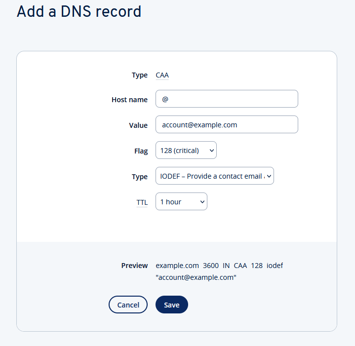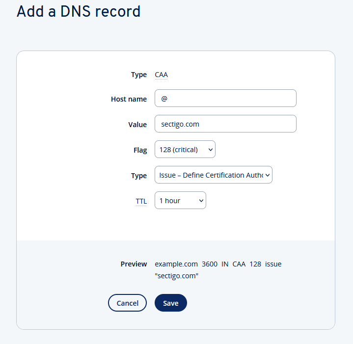 Examples: In the following example, the flag 128 (Critical) and the type Issue Certification Authority (CA) were selected for the domain example.com. The certification authority (CA) was sectigo.com.