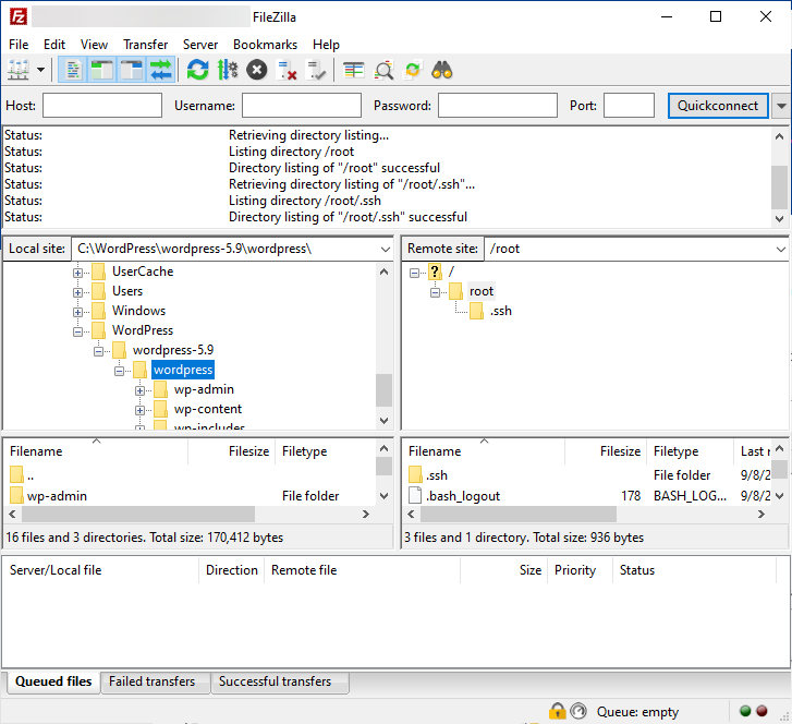 - Wait until you are connected to the server. You have now established an encrypted and secure connection to the server and can start working with FileZilla.