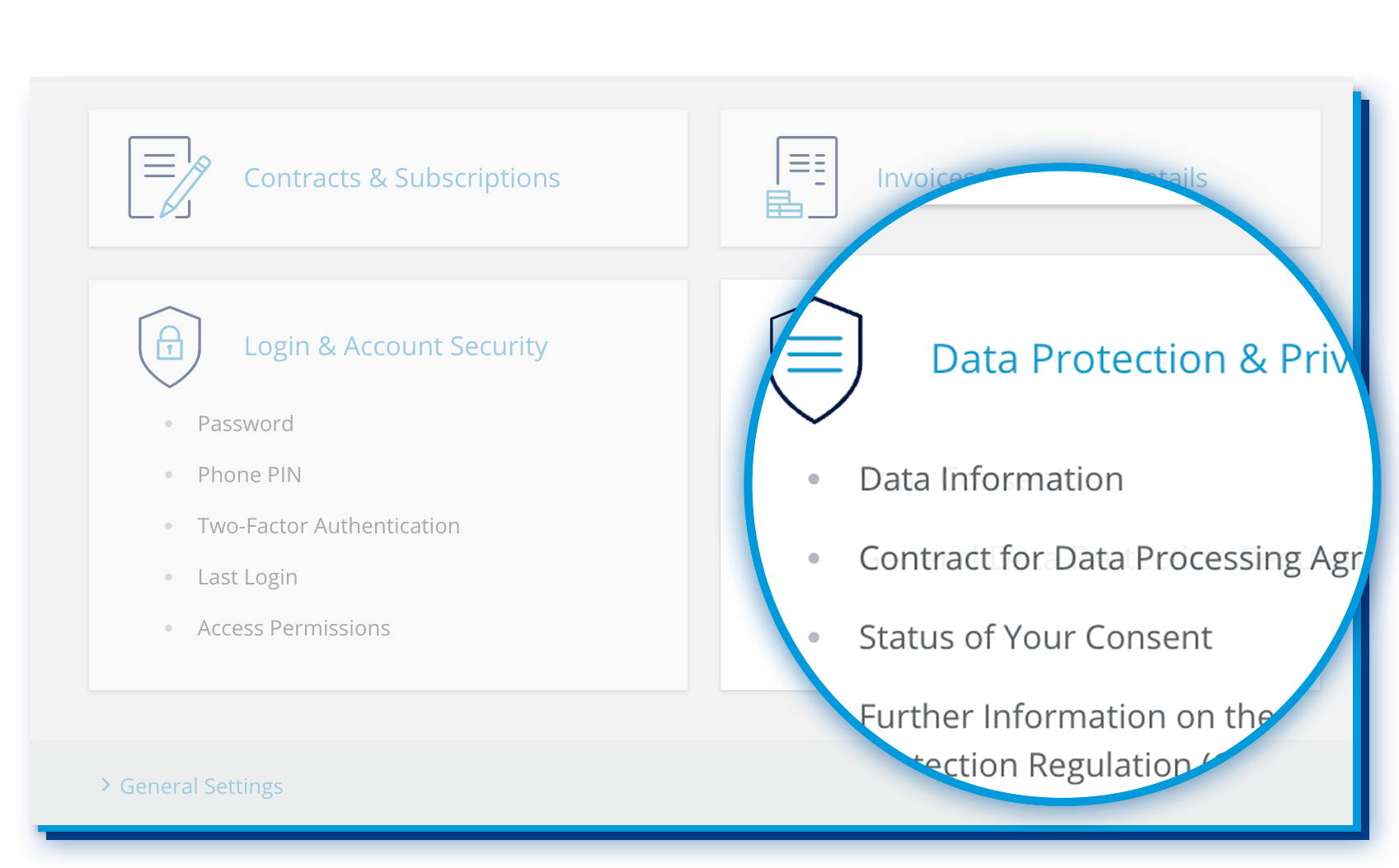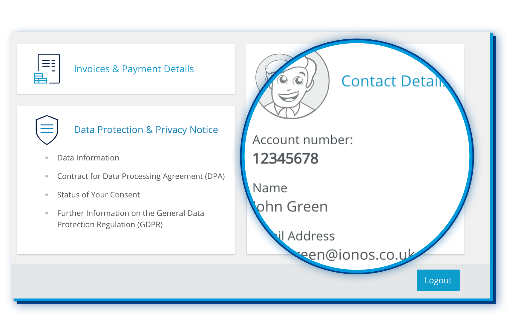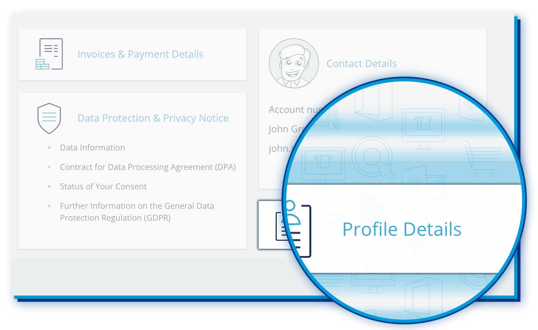 In the top-right of the menu bar, you will find all topics related to your user account, such as your contact details, invoices, payment details and much more. Easily keep track of your invoices or update your payment details at any time. You can also easily manage your data protection settings and update your customer password.