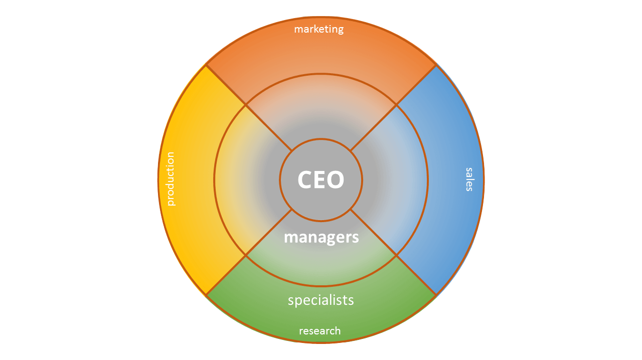 Although there is a hierarchy in this kind of organisational chart, management is not represented at the top, but instead in the middle of the organisation. This implies the ideology that the CEO intervenes less directly in the work of employees and instead communicates their business visions from the inside out. There are only a few levels of middle management, so individual department heads are responsible for more employees but the chains of command are correspondingly shorter.